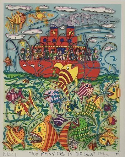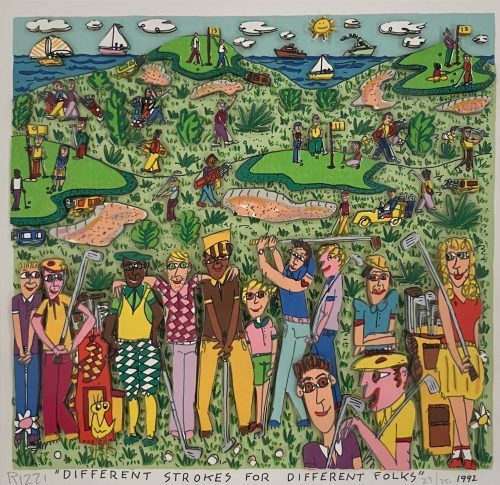 JAMES RIZZI war ein amerikanischer Pop-Art-Künstler und bekannt für einen farbenfrohen, kindlich-naiv anmutenden, linearen Zeichenstil sowie für dreidimensionale Druckgrafiken. Geboren am 5. Oktober 1950 im New Yorker Stadtteil Brooklyn wurde Rizzi von einer Vielzahl von Künstlern inspiriert, darunter Paul Klee, Keith Haring, Andy Warhol und Jean Dubuffet. Er studierte Kunst zunächst am Miami Dade College in der gleichnamigen Stadt und danach an der Universität von Florida in Gainesville, wo er seine einzigartige Technik der dreidimensionalen Druckgrafik entwickelte: Aus einem Duplikat eines handbemalten Siebdrucks, der als Hintergrund dient, schnitt Rizzi zunächst Bildelemente aus. Diese Elemente setzte er, getrennt mit Klebeschaum, dann in eine zweite Ebene darüber. Für den Betrachter kommt es dadurch zu einem 3D-Effekt. Mitte der 1970er Jahre zog Rizzi von Florida wieder nach New York. Die Stadt und ihre Bewohner waren das große Thema Rizzis, der auch offizieller Künstler der Olympischen Spiele 1996 in Atlanta und 1998 in Nagano war. Auch in Deutschland war Rizzi immens populär. Er entwarf Sonderbriefmarken für die Deutsche Post und im Jahr 2008 fand eine große Retrospektive von mehr als 1000 seiner Werke in der Mainzer Rheingoldhalle statt. Rizzi starb am 26. Dezember 2011 im Alter von 61 Jahren in New York.